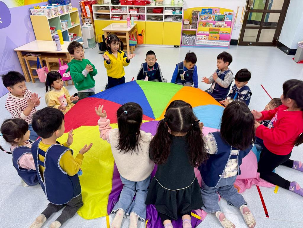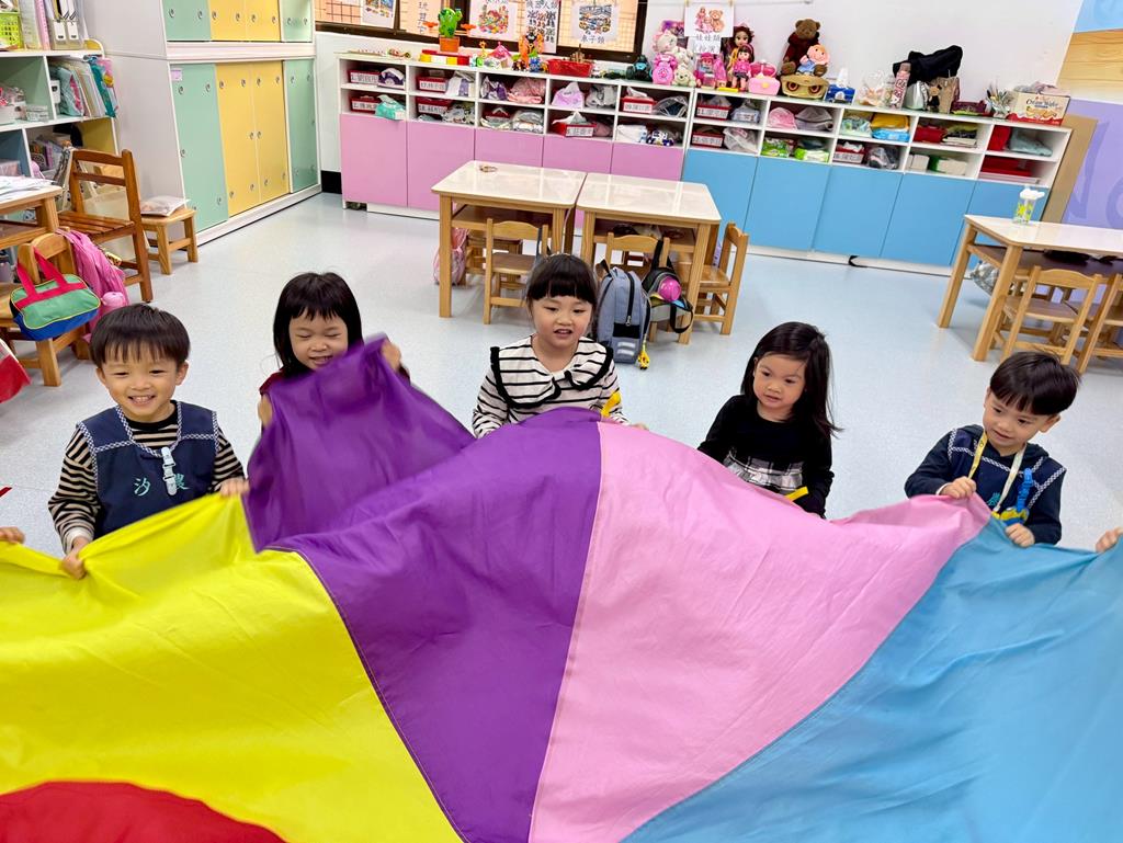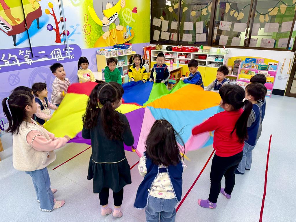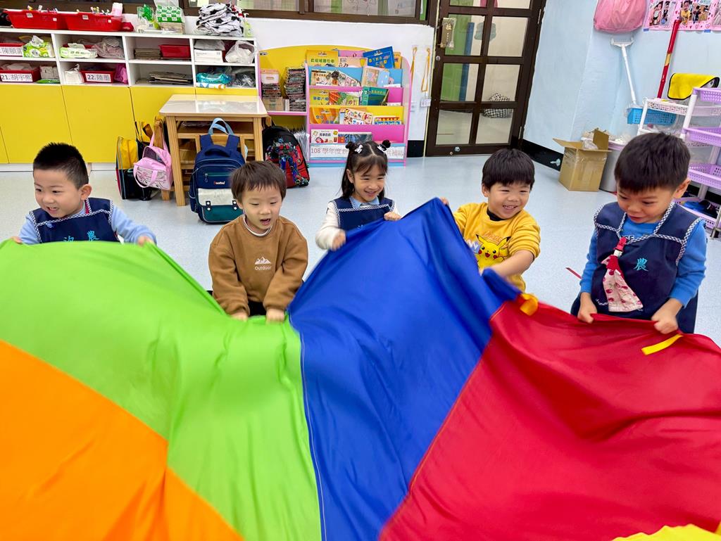 氣球傘+塑膠球-身-中-2-1-1在合作遊戲的情境中練習動作的協調與敏捷。