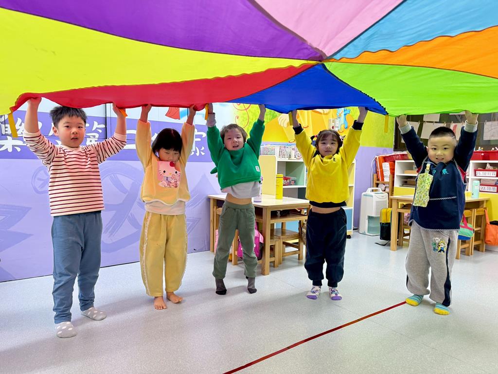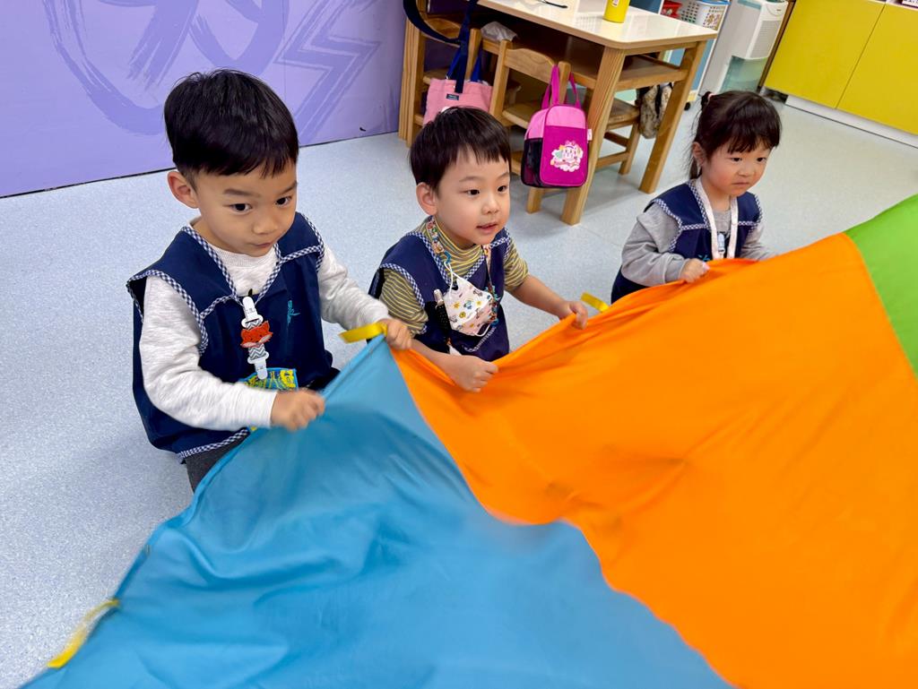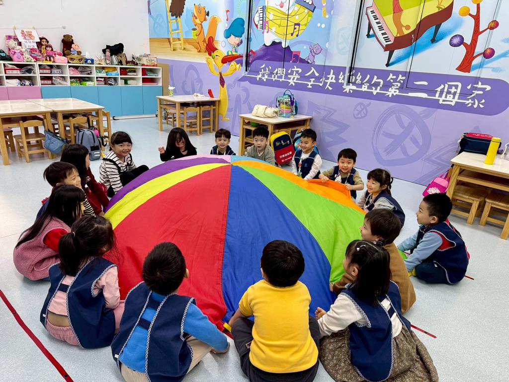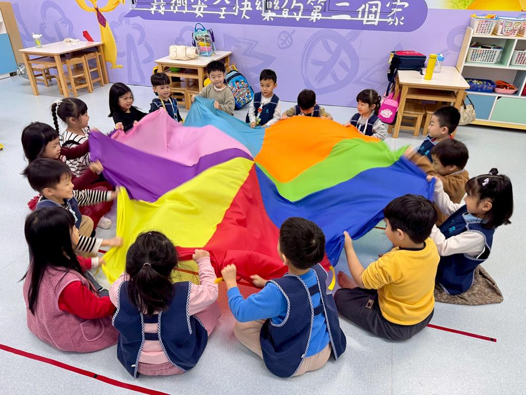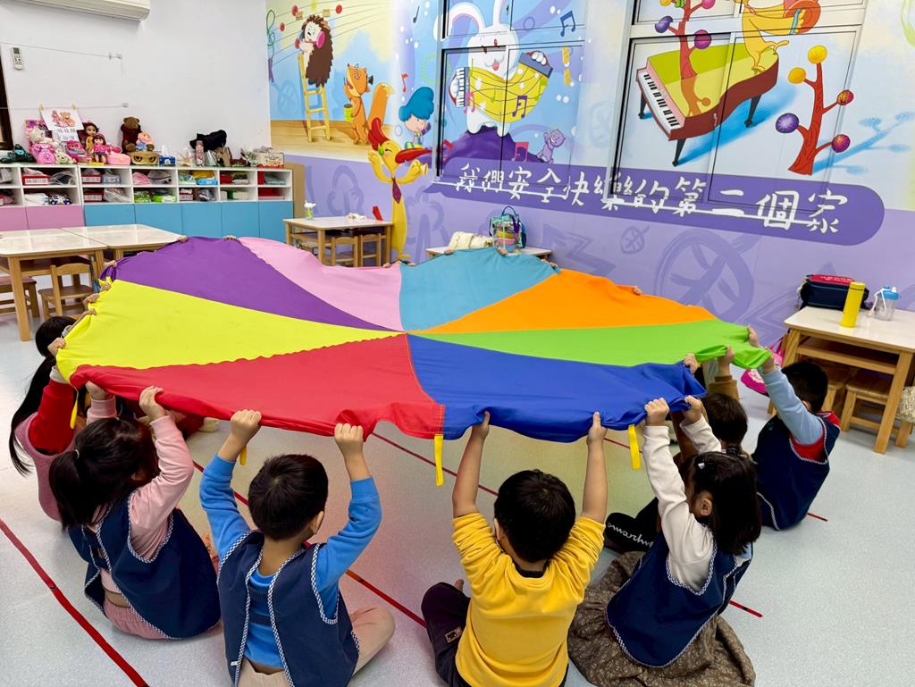 氣球傘+塑膠球-身-中-2-1-1在合作遊戲的情境中練習動作的協調與敏捷。