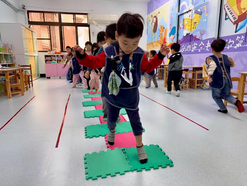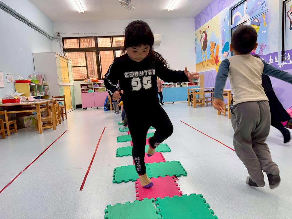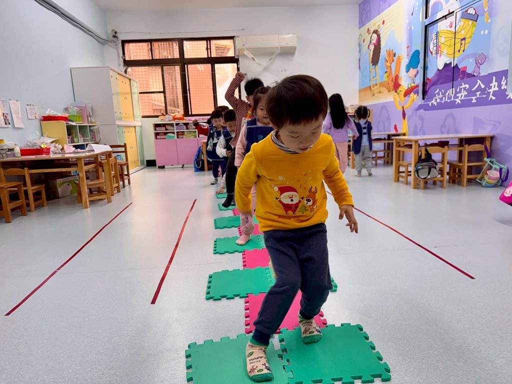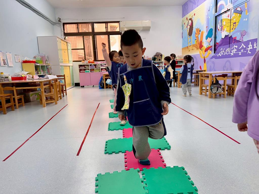 地墊方巾+高蹺-身-中-1-1-1覺察身體在穩定性及移動性動作表現上的協調性。