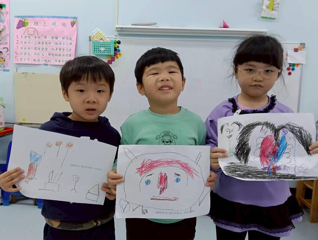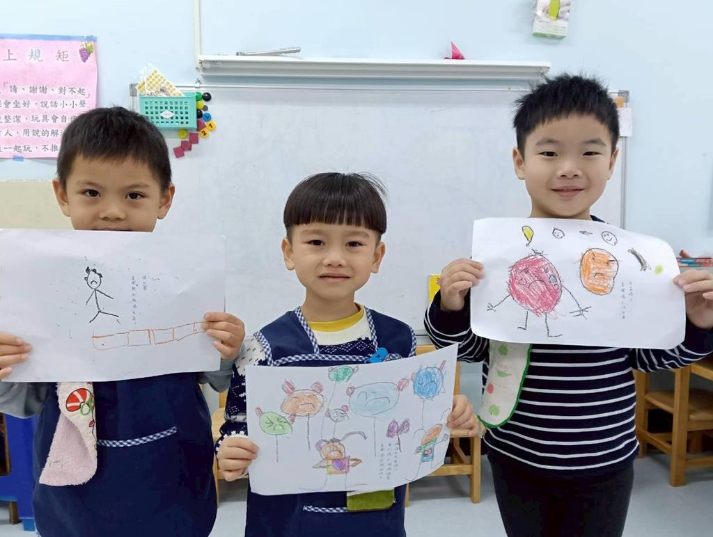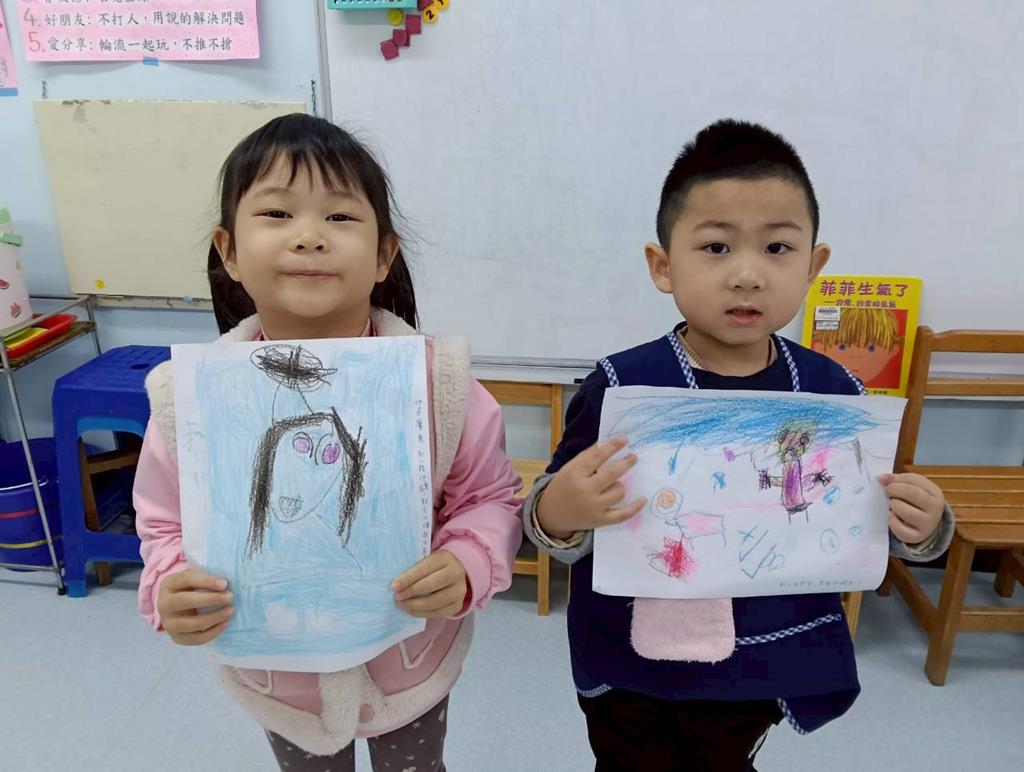 繪本:菲菲生氣了-認識菲菲情緒的變化過程,學習自我調節及適當表達。老師挑選了一 首有明顯情緒或旋律變化的曲子,請幼兒自由發揮畫出你的感覺。