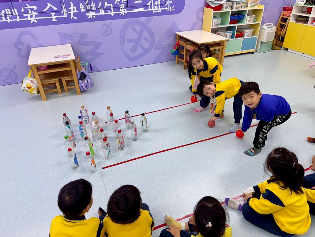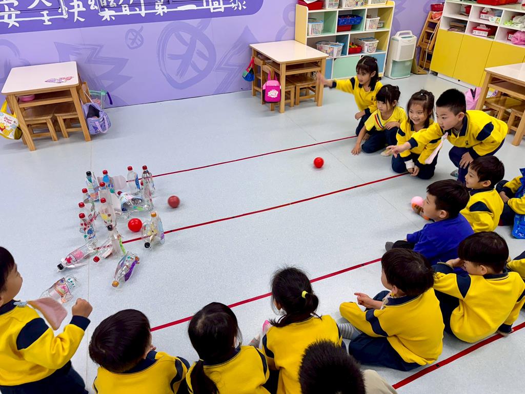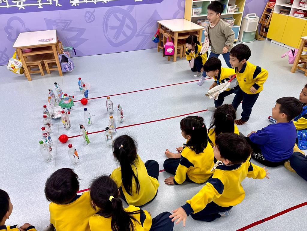 將作品排成保齡球瓶,進行「滾球遊戲」